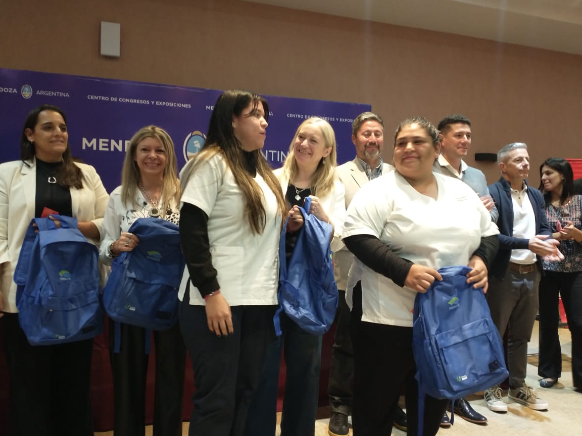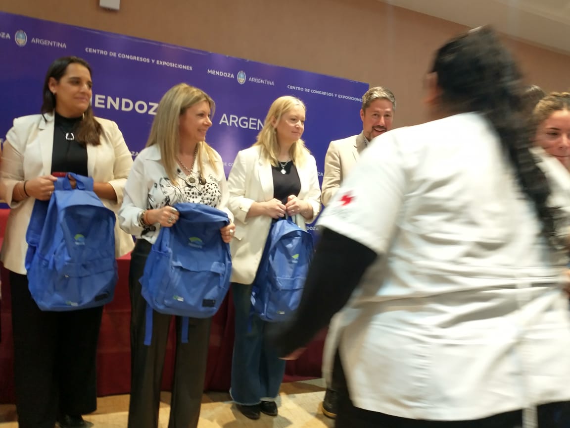 Este lunes, en las instalaciones del Centro de Congresos y Exposiciones Alfredo Bufano, San Rafael, se entregaron mochilas a estudiantes de enfermería de distintos institutos del departamento. La actividad, articulada por la Dirección de Educación Superior dependiente de la DGE y el Pronafe (Programa Nacional de Formación de Enfermería), contó con la presencia de la vicegobernadora de la Provincia, Hebe Casado; la directora del Nivel Superior, Mariela Ramos; la referente de Pronafe, Liliana Cuello, autoridades del gobierno escolar y equipos directivos de los institutos.