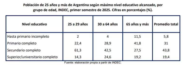Los datos del INDEC muestran además diferencias generacionales. Entre los grupos de 25 a 29 años y 30 a 64 años, predomina el secundario completo, mientras que en mayores de 65 años prevalece el primario completo. El nivel universitario completo alcanza su mayor incidencia en el grupo de 30 a 64 años, con un 24,6%, y desciende al 14,3% entre los más jóvenes.